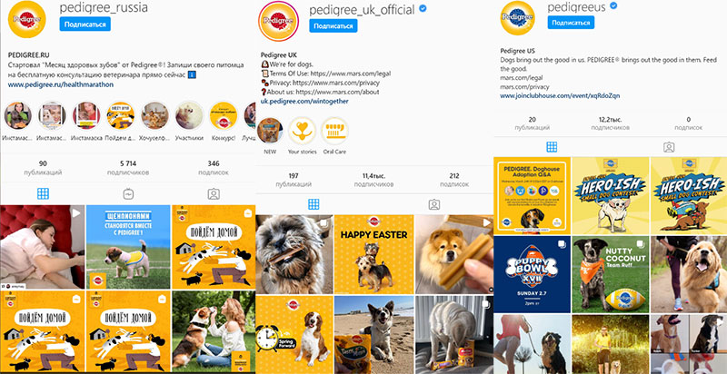 На примере бренда «Педигри» мы видим, что есть и разница в подаче информации: россияне составляют первое впечатление об аккаунте после просмотра рубрики «Актуальное» (кружочки под шапкой профиля) и подчёркивают, что забота о питомце – тяжкий труд; американцы же стремятся обсудить вопросы по уходу за питомцами в социальной сети Clubhouse и считают, что более подвижный и полезный образ жизни – это преимущество хозяев собак, а британцы и вовсе убирают хозяина из объектива и показывают собаку как часть счастливой жизни семьи.