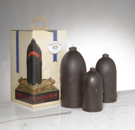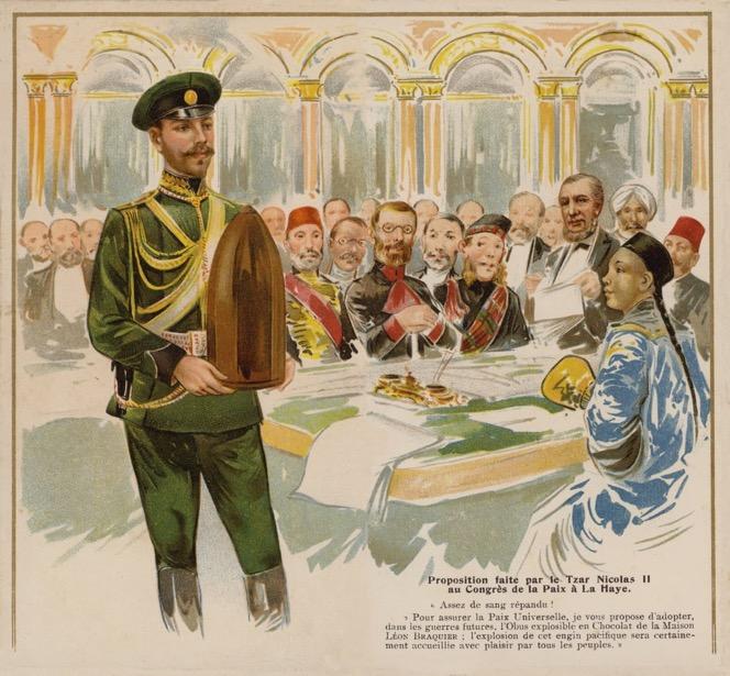 Реклама конфет Бракье «Царь Николай II на Первой Гаагской конференции» (1899). Примерный перевод французского рекламного текста: «Предложение, сделанное царем Николаем II на Конгрессе мира в Гааге. Достаточно пролитой крови! Для обеспечения всеобщего мира я предлагаю использовать в будущих войнах Шоколадный снаряд Дома Леона Бракье; взрыв этого мирного устройства, безусловно, будет приветствоваться всеми».