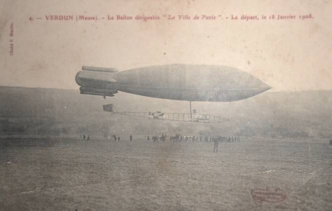 Экспериментальный военный дирижабль “La Ville de Paris” проходит испытания в небе над Верденом 18 января 1908 года.