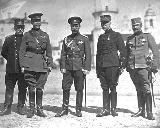 Николай II (в центре) среди представителей держав-союзников. Могилёв, 1916 г.