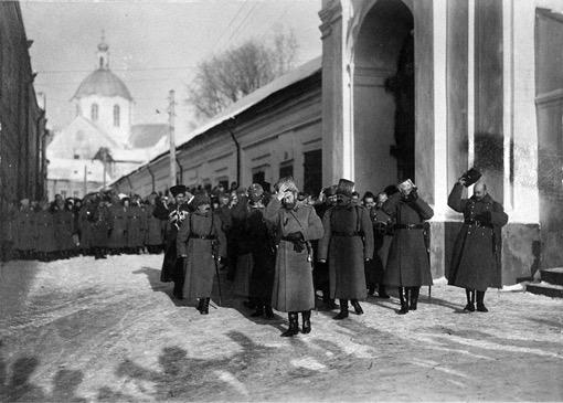 Николай II после молебна выходит из Преображенской церкви. Могилёв, 1916 г.
