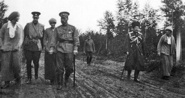 Прогулка в окрестностях Могилёва. Слева направо: Великая княжна Мария, Великий князь Дмитрий Павлович (двоюродный брат императора), Великая княжна Татьяна, Николай II, крайняя справа – Великая княжна Ольга. 1916 год.