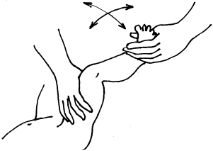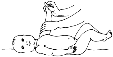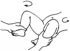 Обеими руками возьмите ребенка за обе голени и совершайте сгибательные движения, аналогичные езде на велосипеде, а также круговые движения (рис. 3, 4). При этом одновременно задействованы коленные и тазобедренные суставы.