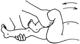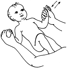 Одной рукой возьмите ребенка за бедро, другой – за голеностопный сустав или голень. Сгибайте в разные стороны (рис. 2). То же самое повторите с другой ногой.