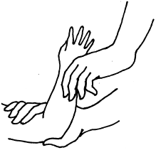 Одной рукой захватите руку ребенка чуть ниже локтя, другой – за пальцы рук. Крутите, наклоняйте, сгибайте его руку в запястье (рис. 5, 6). То же самое повторите с другой рукой.