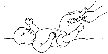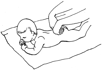 Положите ребенка на бок. Одной рукой придерживайте малыша за ноги, двумя пальцами другой рукой проведите вдоль позвоночника от крестца к шее (рис. 12). В ответ малыш прогибает спинку. Если этого не происходит, повторите поглаживание, чуть усилив нажим. Затем повторите движение, перевернув ребенка на другой бок.