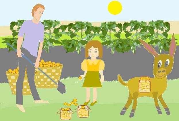 – На тебе, внучка, сумки, собирай картошку, да в корзину носи. А ослик картошку перевезет.