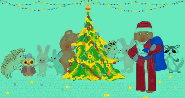 После концерта малыши стали водить хороводы, зовя: «Дедушка Мороз!». А Дед Мороз вскоре появился с большим мешком подарков. Ежик первый увидел Деда Мороза и открыл рот от удивления. Мишутка увидел удивленного ежика, он еще не знал, что пришел Дед Мороз, потому что его не было видно за елкой.
