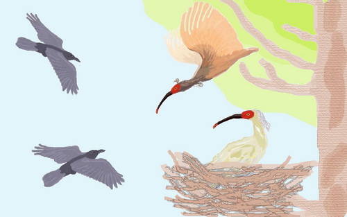 Ибис быстро подлетел к гнезду и набросился на обидчиков. Хохолок над головой его распушился. Он ринулся сначала на более сильного соперника и ударил его своим крылом. Второй обидчик наблюдал, готовясь напасть на самку, если ибис не выиграет единоборство с первым разбойником. Но ибис резко повернулся, набрал высоту и камнем бросился на соперника. У вороны посыпались перья.