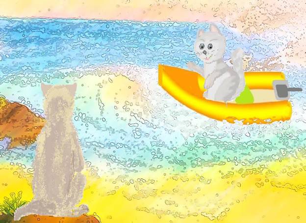 – Эх, прокачу! – кот Матрос завел мотор, и лодка рванула с места. – Держись!