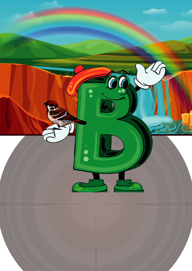 Они вышли из лесу на зеленую поляну с деревянным домиком. Рядом красовалась беседка, в центре которой стоял круглый стол с блюдом. На нем горкой лежали баранки и булочки. Они так аппетитно пахли, что у детей потекли слюнки. Из домика вышла буква Б с большой бутылью. Она сама удивительно походила на эту бутыль.