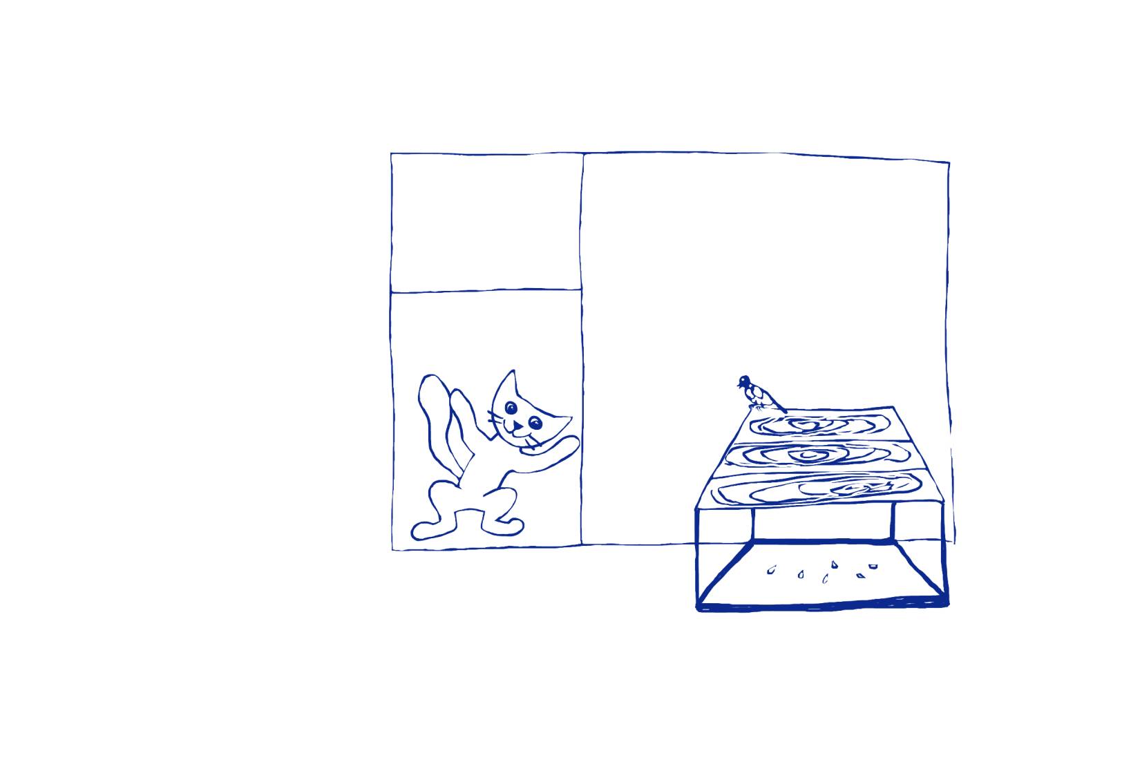 Хозяйка надевает тёплую кофту, открывает окно, наполняет кормушку и уходит.