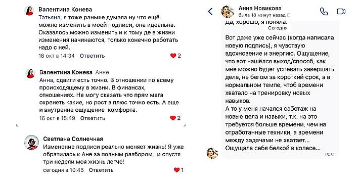 Да, многие из нас не находятся в своей точке Б, о которой мечтают, потому что пока не готовы к ней. Внешнее сопротивление – отражение внутреннего сопротивления. Да, работа с подписью позволяет перенастроить свое внутреннее состояние так, чтобы нужные возможности появились, и Вы могли ими воспользоваться, но это происходит постепенно, по мере внутренней готовности.