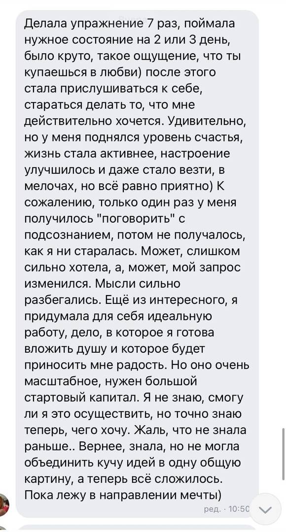 Практикуя эти упражнения регулярно, люди отмечали, что мгновенный эффект в виде гармонизации состояния и изменения отношения к себе на более конструктивное, приводил к накопительному, который выражался в изменения финансового сценария.