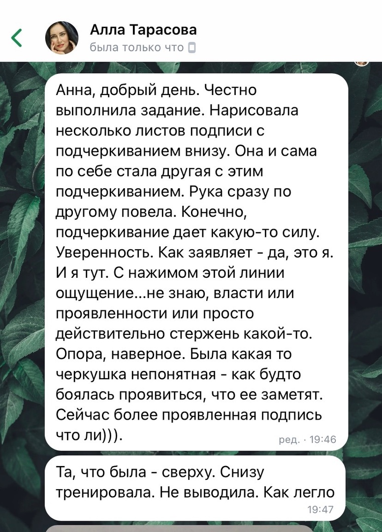 Удивительно, но по мере тренировки новой подписи, клиент начал отмечать, что с ним происходят и внутренние изменения: как будто начали просыпаться нужные качества характера, прибавилось уверенности в себе, появилось больше энергии, открытости новому, уменьшился страх перед будущим. При рисовании новой подписи реагировало даже тело, как происходит на сеансах терапии.