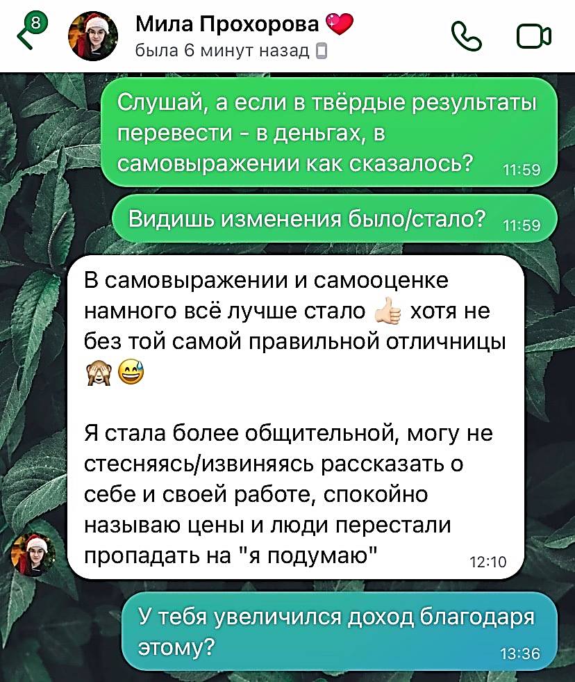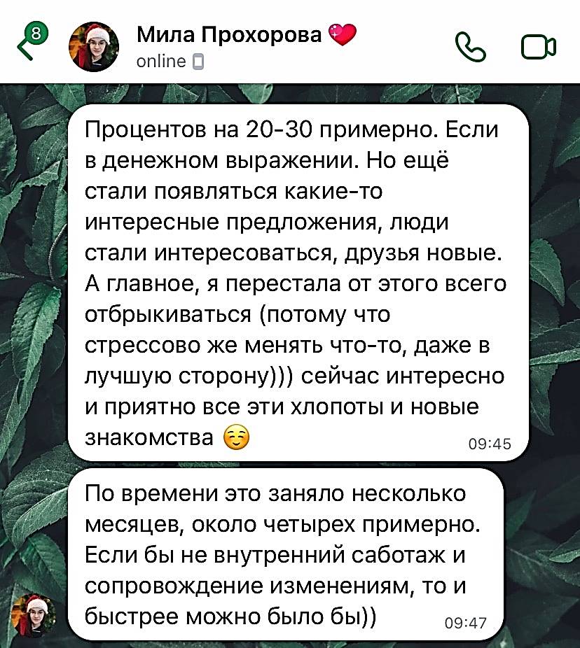 Это новое состояние привело к тому, что он стал легче совершать действия, на которые раньше не мог решиться: например, отправил резюме в крутую компанию, стал рассматривать работу в других городах с более высоким уровнем жизни. Изменения, происходящие в его жизни, он стал воспринимать не со страхом, а с интересом, поэтому легко их принял.
