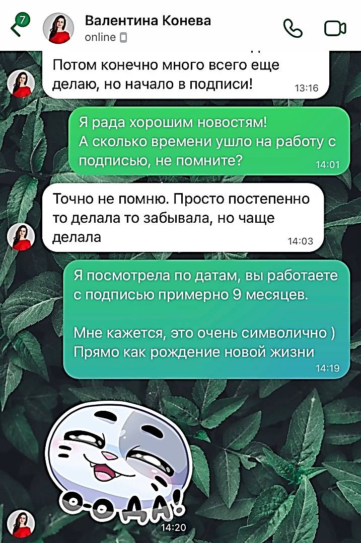 Подпись, соответствующую будущему статусу, мы сделали, но работа с ней не пошла, даже на этапе рисования подписи появилось сопротивление. Кроме этого, действия в направлении цели тоже не складывались, процесс будет остановился. Клиент так и писал: «Изменений нет».