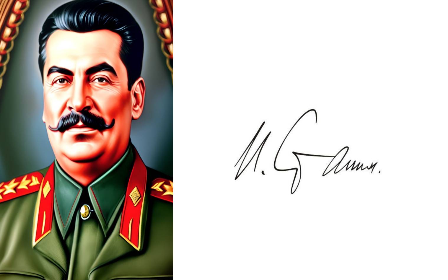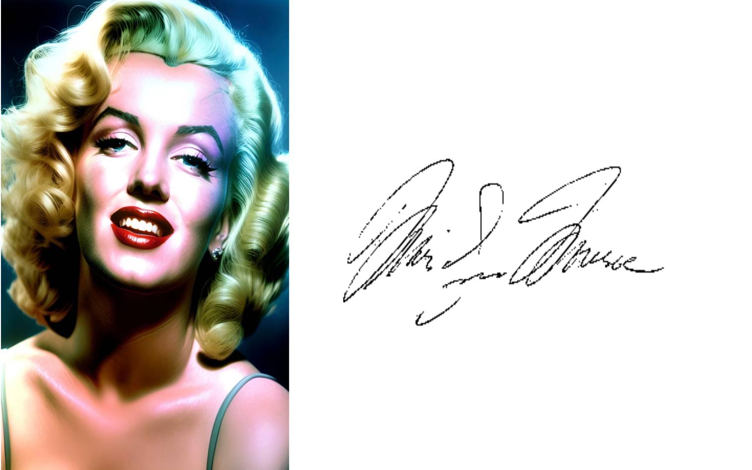Подписи М. Монро и И. Сталина сужаются слева направо как конус: оба изобразили себя в подписи сжимающимися, уменьшающимися.