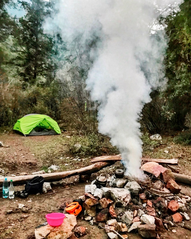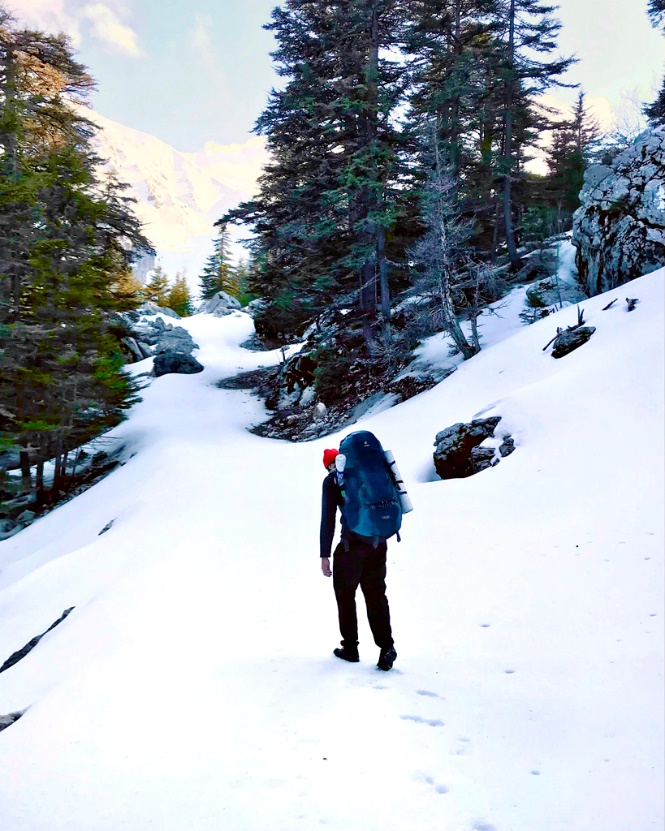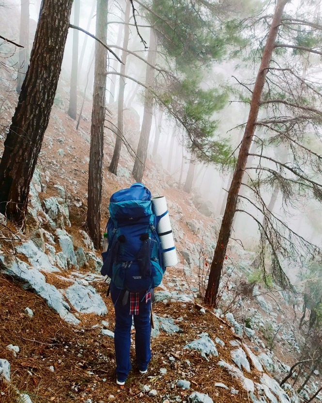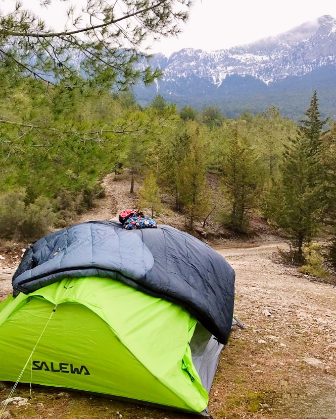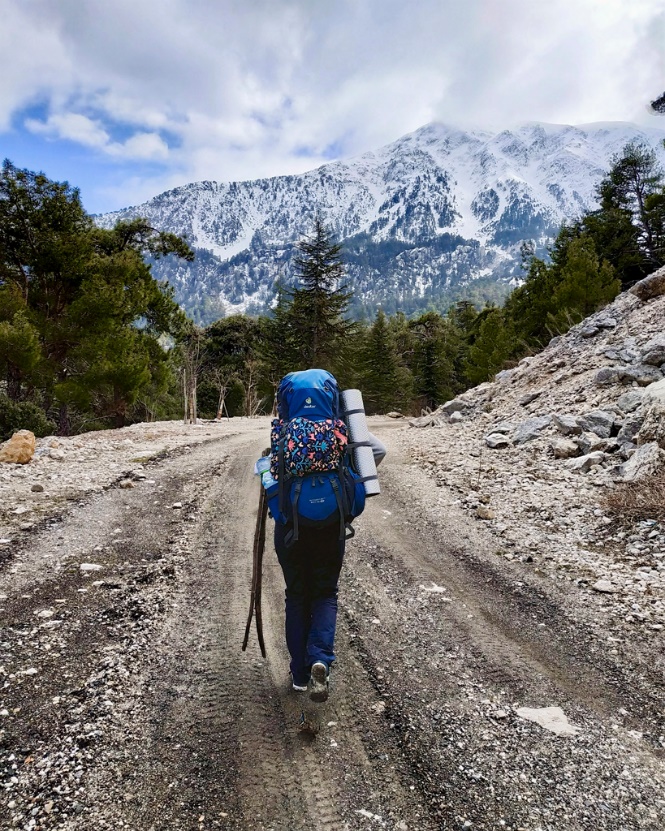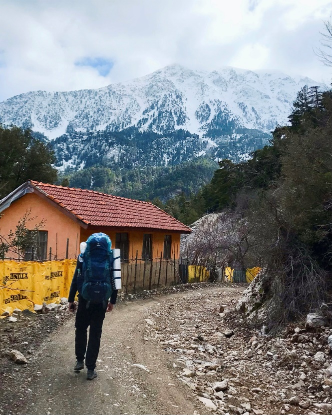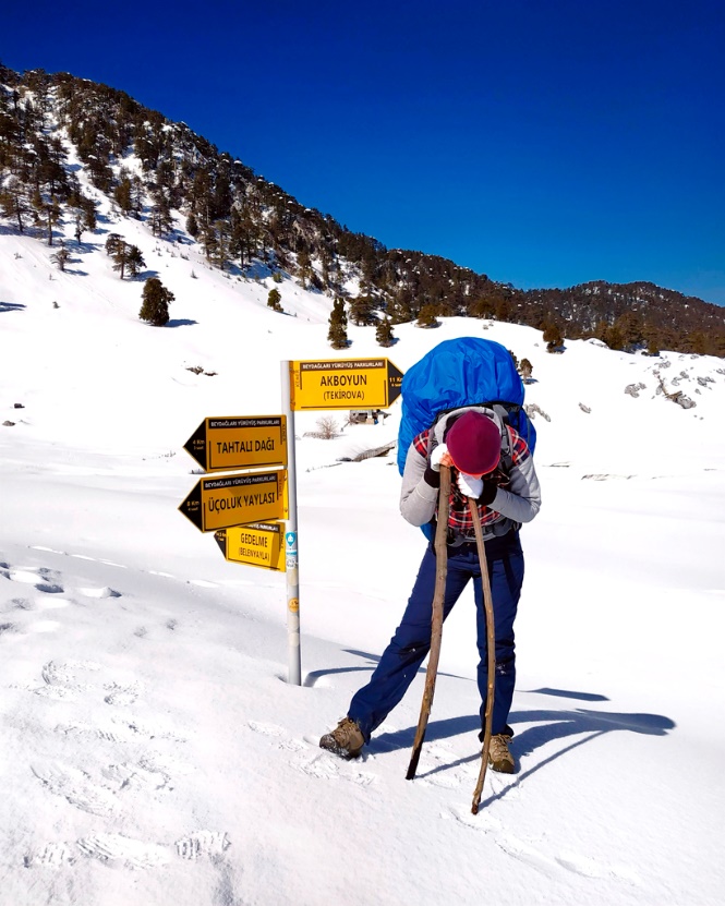 Сегодняшний маршрут проходил у подножия горы Тахталы (тур. Tahtalı Dağları), ее высота 2375 метров над уровнем моря (далее – н.у.м.). Значительная часть Ликийского маршрута проходит вблизи побережья и даже в феврале здесь достаточно тепло, чтобы не брать с собой в поход зимние спальники и теплую одежду. Их захочется выкинуть уже на третий день, потому что они будут не только лишним грузом, который пригодится только раз или два за весь маршрут, но и станут дополнительным весом и объемом в рюкзаке. Только в такие моменты, когда ты поднимаешься на Тахталы, где в это время года еще лежит снег, начинаешь сожалеть о том, что не взял их с собой.