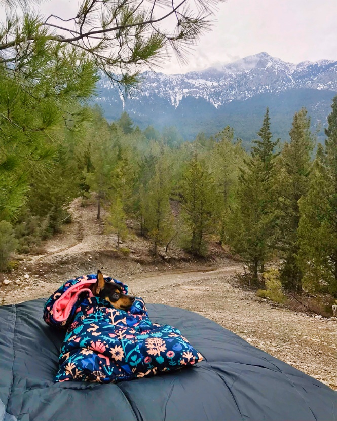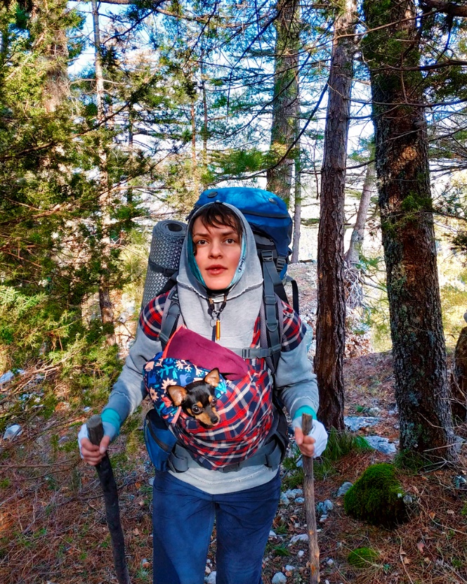 Для того, чтобы пошить для собаки по-настоящему теплый спальник, мы решили немного схитрить и, пока еще жили в Таджикистане, объехали несколько секонд-хэндов в поисках маленького детского комбинезона на пуху. Когда такой нашелся, мы его вывернули наизнанку, отрезали рукава со штанинами, а места срезов аккуратно сшили. Так получился теплый конверт для нашей крохотной собаки. И теперь днем, во время передвижения, когда Болтик уставал, мы усаживали его в спальник и носили по очереди в специальном слинге для собак, который тоже разработали сами во время предыдущего похода. Наша идея со слингами, когда пес под контролем, а руки свободны, настолько понравилась другим владельцам некрупных животных, что их продажа превратилась в наш основной источник дохода. И мы вдруг стали еще и производителями крафтового товара под маркой «Пес с тобой».