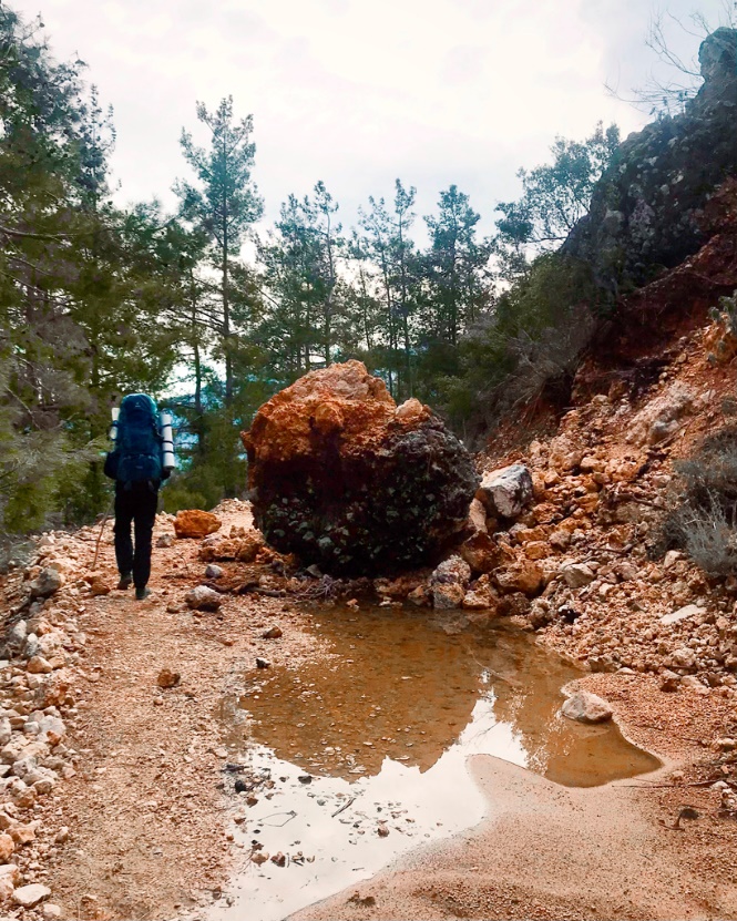 Во время прохождения Ликийской тропы глаза постоянно натыкаются на гильзы от охотничьих ружей. Зеленые, красные, желтые, прозрачные – какие хочешь, здесь много стреляют и любят охотиться. Турция входит в список стран, где законом разрешено ношение оружия, поэтому стрельбе в горах никто из местных не удивляется. Сама же тропа в это время года часто оказывается затопленной, размытой или обрушившейся, и чем дальше мы передвигаемся, тем чаще с этим сталкиваемся. Затопления пока еще легкопроходимые, нам даже не приходится разуваться, мы просто накидываем в воду тропинку из камней и перескакиваем по ним. Часто встречаются и камнепады, особенно впечатляют глыбы с человеческий рост. Они скатываются на тропу словно выброшенные рукой гиганта и иногда кажется, что среди них можно услышать шепот ветра, рассказывающего о древней цивилизации, когда-то существовавшей в этой местности.