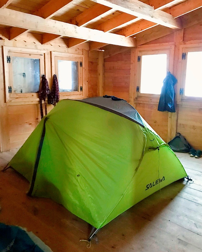 К моменту, когда уже надо было определяться с местом для ночлега, мы наткнулись на пустой дом. Он выглядел как настоящее спасение, чтобы мы могли укрыться в нем от ветра и диких животных – следы на снегу выдавали их присутствие. Мы никогда не оставляем после себя мусор и не берем чужого, если встречаем брошенные дома или недострой, вот и в этот раз хотели спрятаться в этом прекрасном укрытии на ночь, но входная дверь была приварена. Немного расстроившись, мы поставили палатку чуть в стороне, на снегу. Световой день уже подходил к концу, и температура резко начала падать. Наша обувь промокла от снега еще во время дневного восхождения, носки тоже. Я первым делом переобулась в сухое. Промокшее снаряжение развесили у костра, чтобы подсыхало. И пока мы готовили ужин, окончательно похолодало, температура упала ниже нуля. Я, волнуясь о том, что скоро станет еще холоднее, предложила окопать нашу палатку, сделав из снега защитную юбку, чтобы холодный воздух не проникал к нам внутрь через высоко расположенный тент.