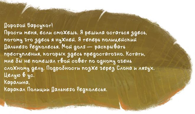 Очень сложно сказать, что стало решающим аргументом: враньё ли Медеи (Боги Манго, зачем ей врать?!), или печально опущенный хвост гепарда (хотя при чём тут печальный хвост, что вообще за бред?), или то, что Геп отказался меня заменить в качестве каракала полиции, а Попка, наоборот, захотел, и в итоге я фактически бросила только что открывшийся полицейский участок на умственно отсталого попугая, или, может быть, обвинения попугая в том, что я не справилась с делом, или то, что я и правда бросаю расследование, бросаю своих – и лечу на другой конец бескрайней Земной Доски, чтобы стать барсуком полиции, хотя барсуков полиции в Дальнем Лесу как раз предостаточно. Я не знаю, что стало решающим аргументом. Ничего по отдельности. И всё это вместе.