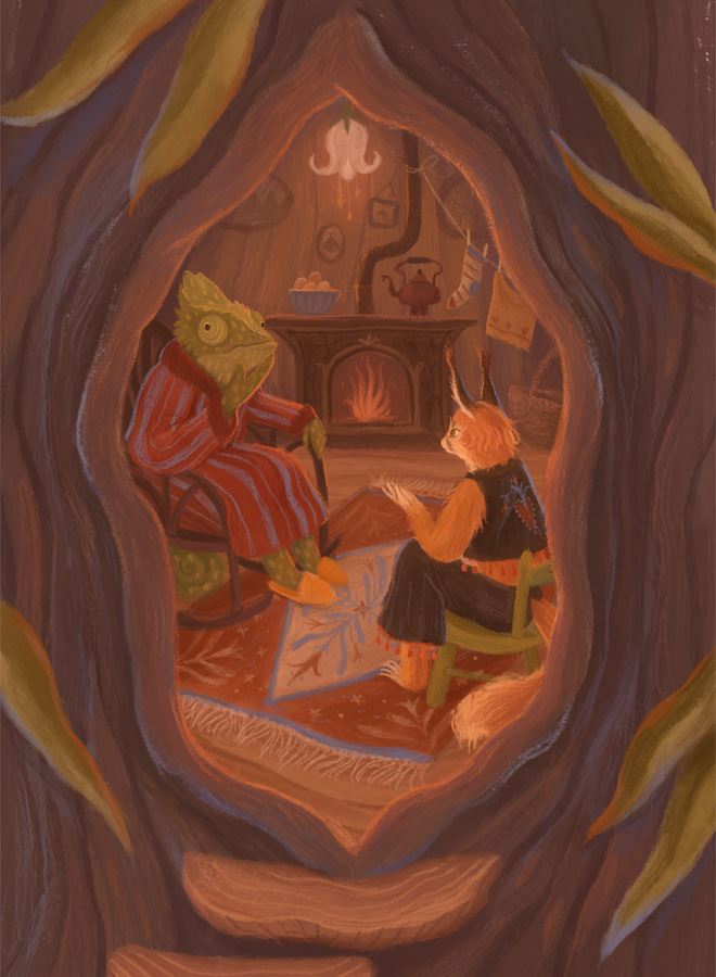 После жёсткого пеленания и не менее жёсткого приземления в скалах шерсть моя выглядела не лучшим образом, поэтому я тщательно вылизалась, прежде чем явиться к Старушке Фиге, в дупле которой обитает старина Хэм. Я не менее получаса излагала ему все обстоятельства фалькокошного дела, объясняла, насколько его помощь необходима и насколько он незаменим в качестве эксперта-криминалиста, умоляла стать сотрудником Полиции Дальнего Редколесья, обещала перспективы карьерного роста… Всё это время старина Хэм молча менял цвета от серо-зелёного до лилового и обратно; правый глаз его неподвижно и без всякого выражения смотрел на меня, левый же вертелся против часовой стрелки, наблюдая за полётом мухи цеце, кружившей над старым фиговым деревом.