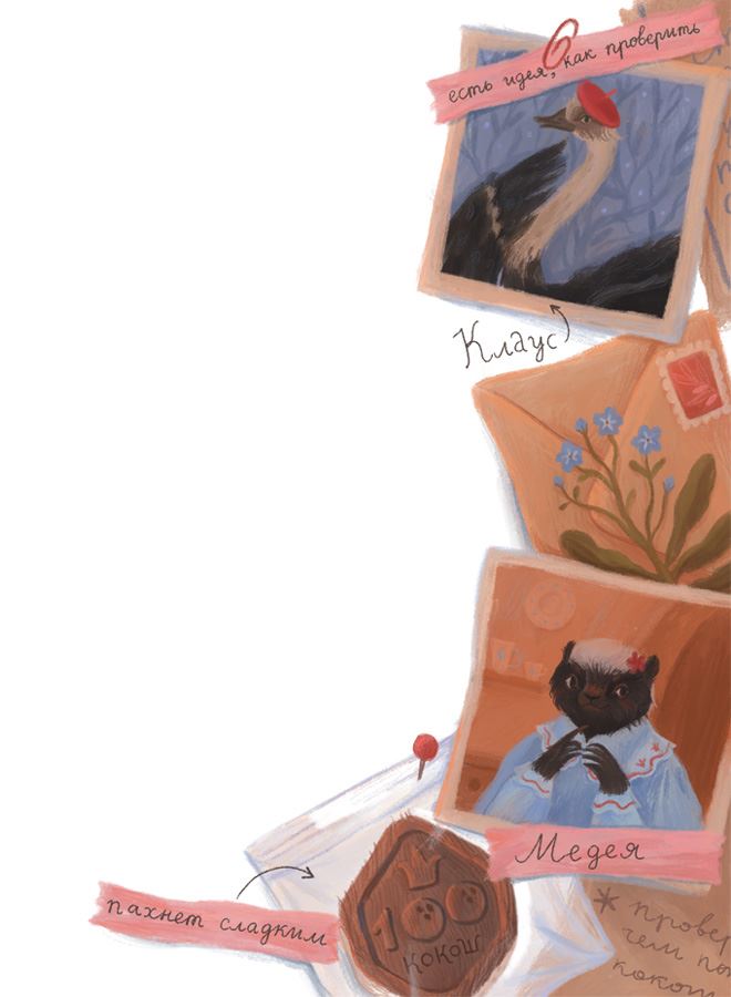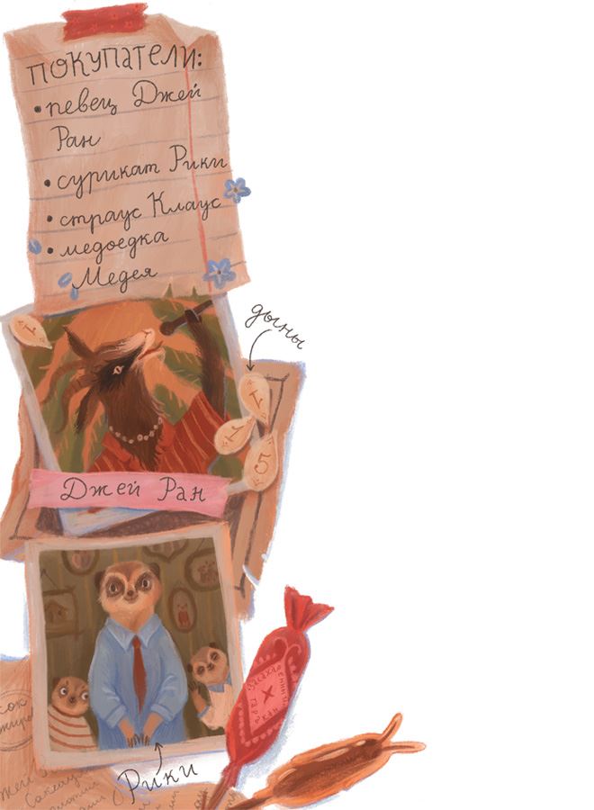 Джея Рана можно было исключить сразу. Парнокопытный певец из Саксаульного Леса заехал к нам в Дальнее Редколесье в рамках мирового турне по всей Земной Доске (лично мне его творчество кажется пошлым и старомодным: бесконечные страдания немолодого козла по юным самкам с очень стройными копытами). Со слов Гадюки, он ехал в поезде в обнимку с антилопой Илопой и всю дорогу покупал ей коктейли с мелиссой на кокосовом молоке. Как подозреваемый он отпадает, потому что расплачивался вообще не кокошами, а саксаульной валютой – дынами (собственно, их я сначала и приняла за простые семечки). Из-за разницы в курсах у Гадюки в результате была почти полная тележка этих дынов.