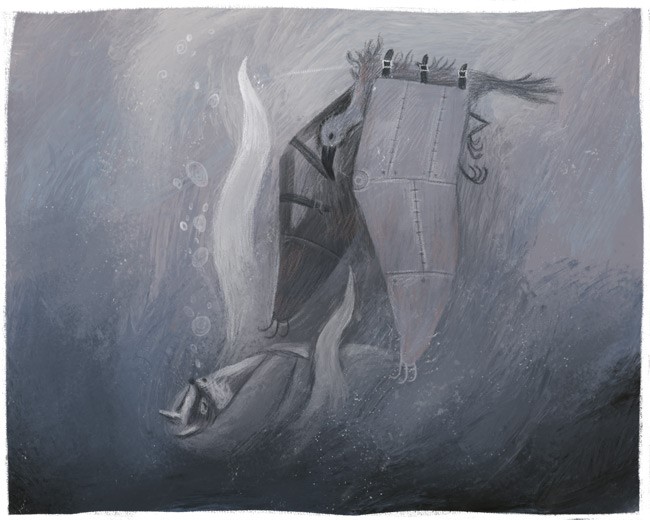 Если зверь при жизни вёл себя дурно, если чёрных пятен на нём больше, чем белых, из-под линии горизонта к нему поднимется Подземная Акула – и утянет его на дно Глубокого Океана. И никогда не будет такому зверю покоя, и вечно будет он бродить в одиночестве по пустынному дну, подгоняемый холодным течением и острыми плавниками акул…».