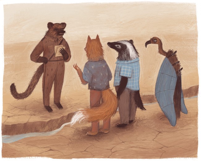 – Пр-р-редъявить р-р-разрешения и мигр-р-р-рационную кар-р-рту для пер-р-рехода гр-р-раницы! – рявкнул пограничник в пятнистой униформе, когда Барсукот, Барсук Старший и Гриф Стервятник приблизились к руслу ручья. У пограничника были большие, круглые, напряжённые чёрно-жёлтые уши, мрачная чёрная морда в обрамлении пегой шерсти и внимательные, недоверчивые глаза.