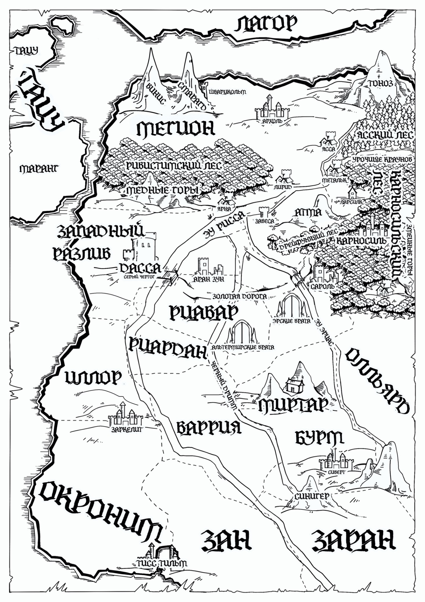 – Королевство Западный Разлив состоит из множества провинций: на севере находится земля Бальнард, где правит род Энвиронов, Медными Горами управляет род Нон-Беренов, Драконьими землями управляют Маллеки; следом идет Королевская равнина; на юге расположен Риавар, – выдавил Играм и заплакал.