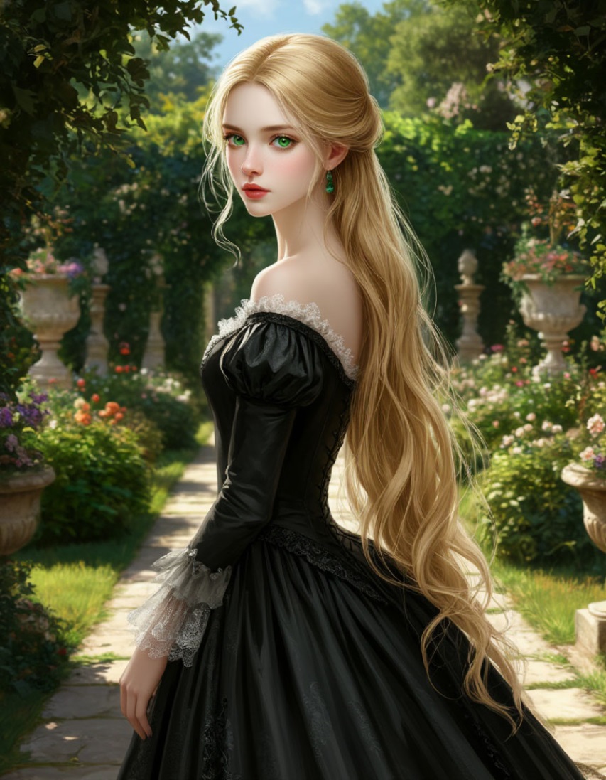 Его взору представилась девушка, с бледно блондинистыми локонами, тусклыми, как припыленный изумруд глазами, в чёрном платье, и бледной как фарфор кожей.