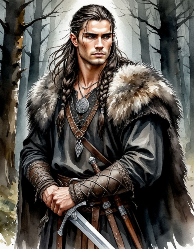 – Иди ты в медвежью петлю, хах, – Ответил Лэйфр, откинув полог из медвежьей шкуры. Из лачуги вышел мужчина, чей облик дышал силой и уверенностью. В свои двадцать с небольшим он возвышался над остальными, словно дуб над молодняком, унаследовав от отца Бьерна широкие плечи и статью. Тёмно-каштановые волосы, с выбритым виском, будто выхваченным из тени, и косым пробором, напоминали крыло ворона. Прядь волос, зализанная пчелиным воском, словно застывший янтарь, падала на лоб. В тёмно-карих глазах с проблесками янтаря горел огонь, а светлая кожа оттенялась усами и бородкой, словно тенью, только-только пробившейся сквозь землю. Он был облачен в льняную рубаху, кожаные штаны свободного кроя, заправленные в сапоги до колен. Поверх рубахи – жилет из чёрной кожи, усыпанный металлическими заклёпками, словно чешуей дракона. На поясе висел меч и кинжал в ножнах, словно верные слуги, готовые в любой момент встать на защиту. А на плечах покоилась накидка из волчьих шкур с металлической застежкой, будто символ власти и силы, оберегающий от невзгод.