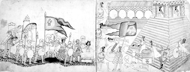 «Въезд Кортеса в Уитцилан». Миниатюра из Кодекса Ацкатитлана. Мексика, XVI век