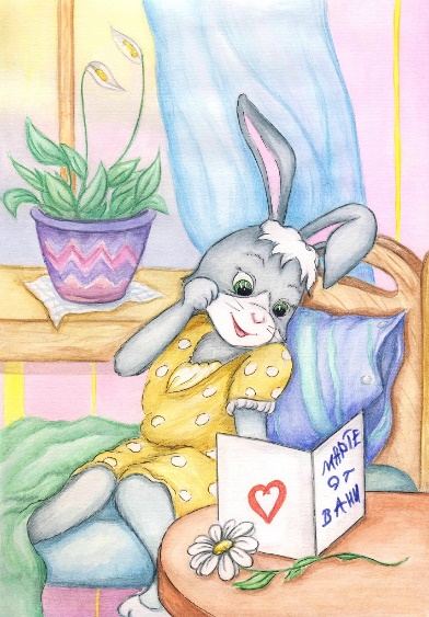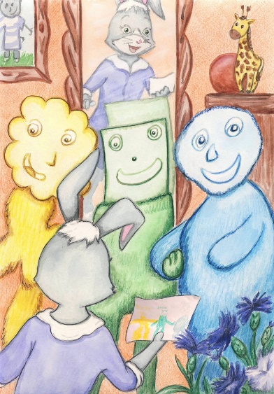 Радостная, верящая в себя зайка взяла свой рисунок и пошла к маме попросить, чтобы его вставили в рамку.