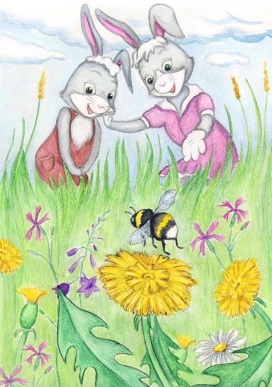 На одуванчик, который был рядом с зайчатами, сел толстый шмель. Он стал громко жужжать. Первой его заметила Марта. Зайка тихо сказала братику: