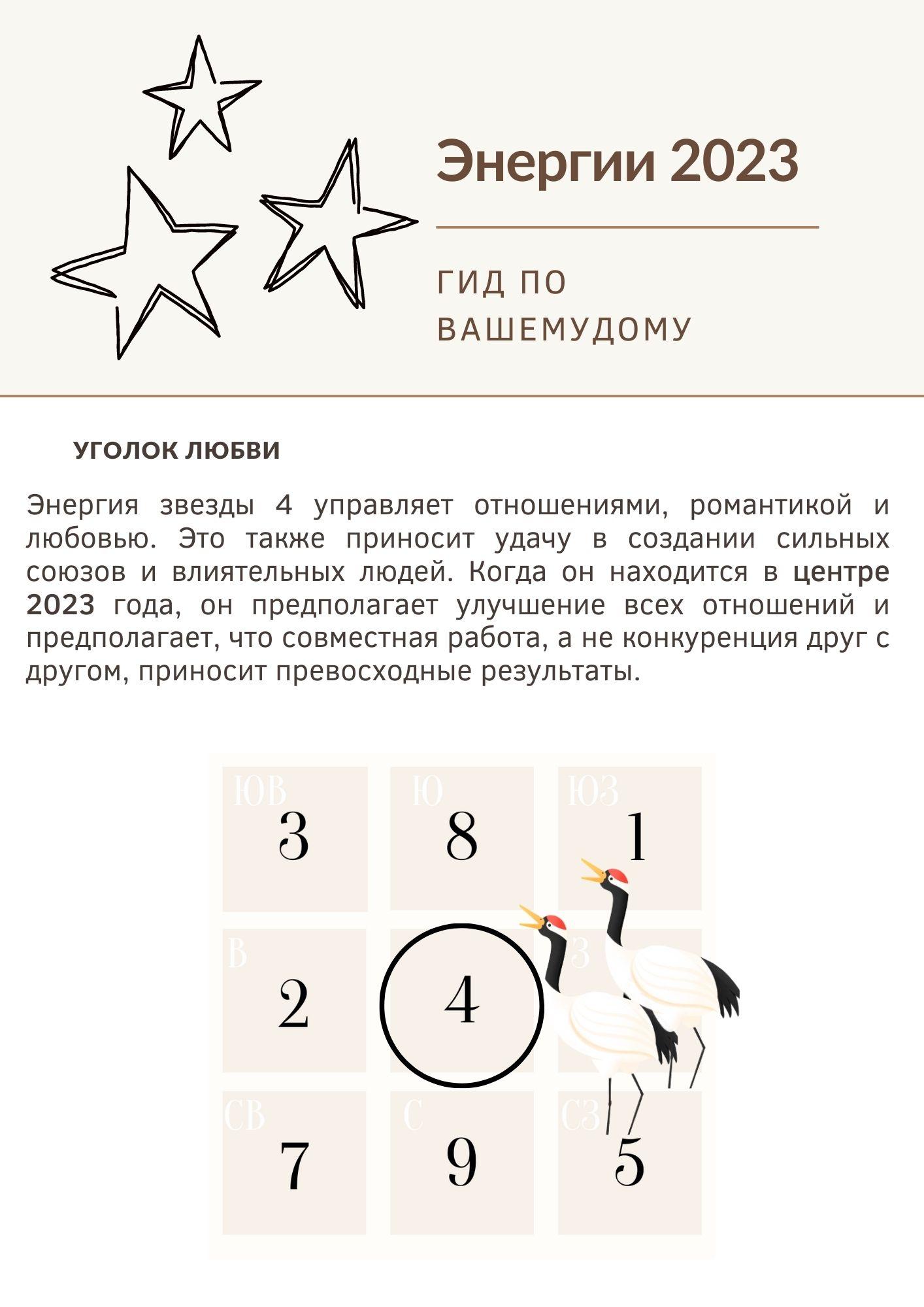 В 2023 году доминирующей звездой является 4, поэтому она будет иметь наибольшее влияние в каждом доме. Таким образом, необходимо максимально использовать эту звезду, поскольку счастливые эффекты звезды 4 медленно меняются по мере того, как мы переходим к периоду 9. Усиление эффекта этой звезды в каждом доме чрезвычайно важно.