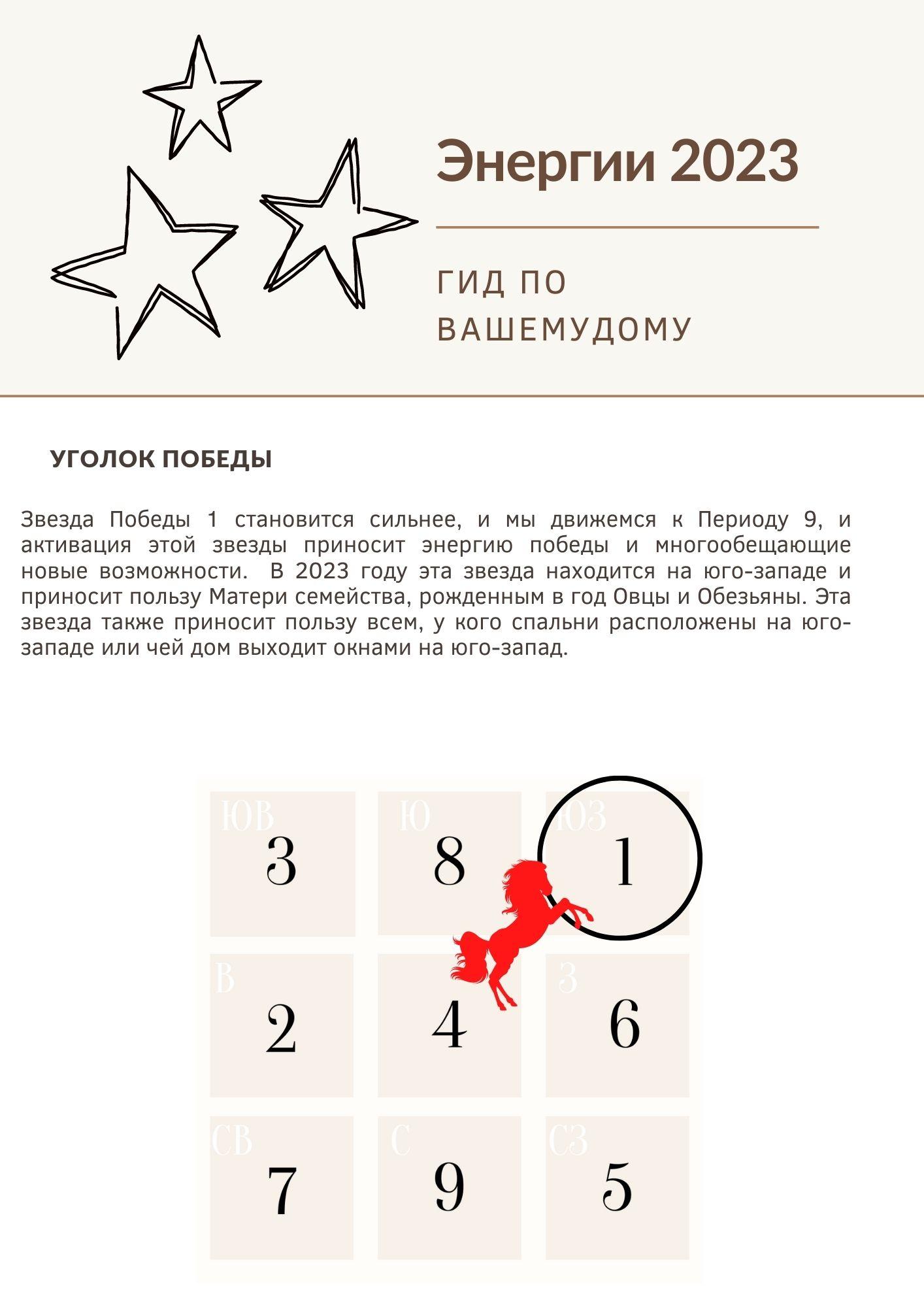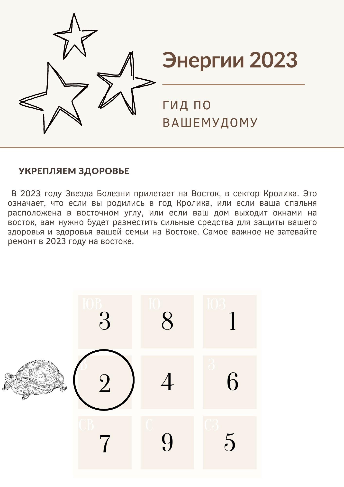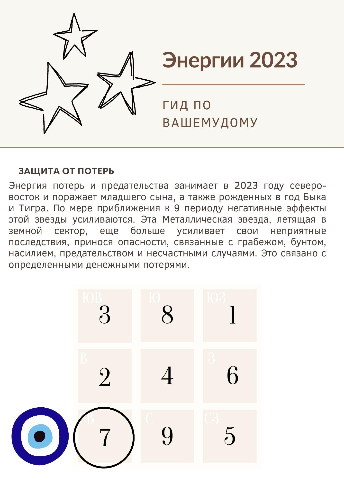 Самая важная часть года заключается в обновлении фэн-шуй вашего дома. Обычно это делается после 21 декабря , когда начинает меняться переход от энергии предыдущего года к энергии наступающего года. Изменение начинается с того, что Тай Суй и 3 убийства вступают в силу с 21 декабря 2022 года, а ежегодные летающие звезды вступают в силу с 4 февраля 2023 года .2023 год – последний год 8-го периода, прежде чем мы перейдем к 9-му периоду в феврале 2024 года. Хотя 9-й период еще не начался, всегда есть переходный период, когда энергии годовых звезд трансформируются, и именно поэтому Фэн Шуй на 2023 год особенно важен. Нужно учитывать и готовиться к переходу на новый период.