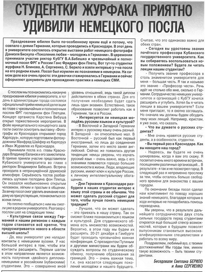 Так прошли два первых курса упорной учебы и работы, дни сильно не отличались друг от друга. Дело двигалось к экватору обучения, вот-вот наступала зима, к концу подходил 2004 год. Мы – третьекурсники, а это, как вы понимаете, уже что-то да значит, собрались в большой аудитории на лекцию по философии. Занятия Владимира Трояна любили массово. Как вдруг дверь аудитории распахнулась, и в нее вошел наш декан: «В университет с визитом прибыл посол Германии Ханс-Фридрих фон Плетц в рамках Дней культуры Германии в Краснодаре. Нужно взять интервью на немецком. Кто готов?»