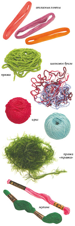 Для тонкой прорисовки, например, жилок листьев, лучше использовать нитки из натурального или искусственного шелка. Эти же нитки прекрасно подойдут для сосборивания и сшивания изделий. Вы можете украсить вышивку шелковым букле. Эти нитки прекрасно подходят для вышивания отдельных элементов мотивов. Для создания дополнительной фактуры в вышивке подходят различные виды пряжи. Особенно хороша так называемая «травка» – синтетическая пряжа средней толщины с впряденными в нее длинными волокнами.