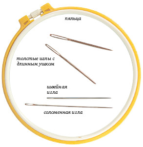 Размер пяльцев подбирают так, чтобы рисунок умещался в них целиком. Старайтесь приобретать пяльцы, зажим ткани в которых регулируется винтом. Вышивать легче, если ткань сильно натянута. Форма пяльцев не имеет большого значения. Обычно используют традиционные круглые, но вы можете приобрести пяльцы разной формы: овальные, квадратные или треугольные. Лучше, если пяльцы закреплены на штативе. Для вышивки лентами используют толстые иглы с длинным ушком. Лента должна проходить через ушко иглы без заминов. Такие иглы имеют треугольную форму: они довольно короткие и сильно расширяются от кончика к ушку. В продаже можно увидеть наборы из двух игл для шитья пряжей и шерстью: с острым и с тупым кончиком. Эти иглы идеально подходят для вышивки лентами. Для некоторых швов нитками вам понадобится соломенная игла. Это длинная острая игла средней толщины со средним размером ушка. Вам часто придется сосборивать ленты. Для этого используют обычную швейную иглу. Этой иглой удобно закреплять на ткани объемные мотивы, вышитые вприкреп. Для раскроя ткани подойдут большие ножницы с прямыми лезвиями. Для обрезания лент и ниток пригодятся маленькие ножницы с прямыми лезвиями.