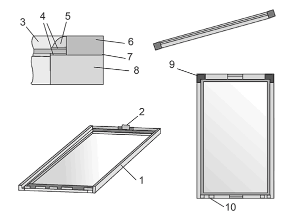 Рис. 8. Изготовление парниковых рам: 1 – рама по размеру стекла; 2 – ручка; 3 – стекло; 4 – замазка с двух сторон; 5 – штапик или гвозди с замазкой; 6 – брусок 40 × 20 мм; 7 – место склейки водоустойчивым клеем; 8 – брусок 55 × 30 мм; 9 – стальной угольник; 10 – накладка для упора.