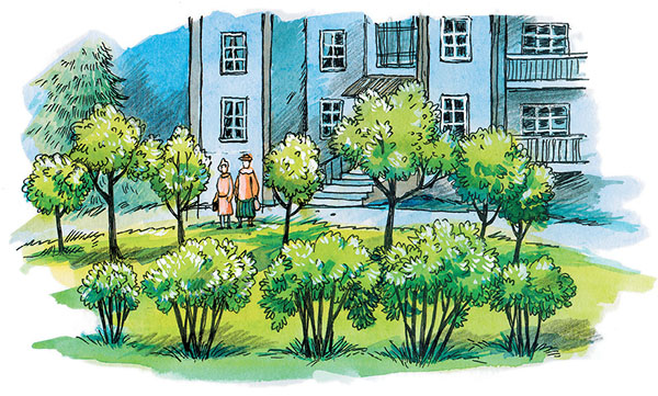 Общее дело объединило жильцов корпуса «Ц». Все ухаживали за посадками, а летом молодежь чуть ли не жалела, что уезжает из дома на каникулы, вместо того чтобы заботиться о своих собственных кустах и деревьях. Аврора и Сократ тоже ненадолго уезжали к папиной маме в Бесбю, но, когда вернулись домой, обнаружили на лужайке кусты с почти созревшей красной и чёрной смородиной.