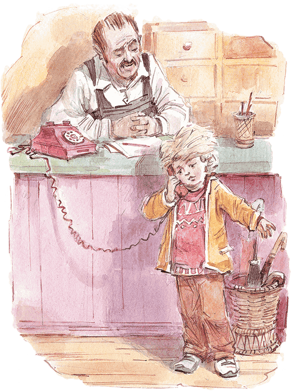 Между тем хозяин тоже вёл себя очень странно. Был страшно занят, глаз не поднимал и едва поздоровался с Малышом и мамой. Она, кстати, сразу взялась расставлять товар на полках, чтобы тоже не стоять без дела, и Малыш вышел на улицу. Он чувствовал, что сейчас не надо досаждать взрослым расспросами. Вдруг на крыльцо выскочил запыхавшийся хозяин.