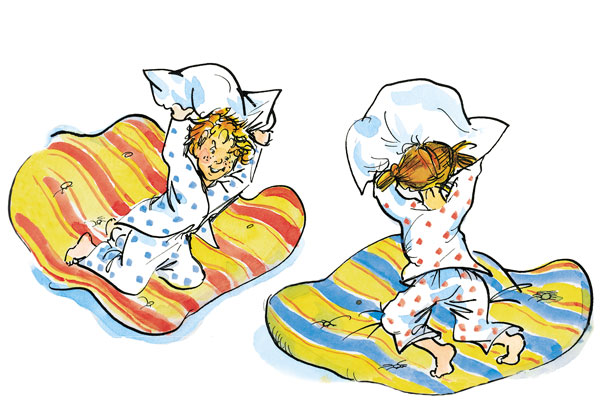 Папа, мама и восемь детей жили в высоком каменном доме в самом центре огромного города. И хотя семья была такой большой, их квартира состояла всего-навсего из одной комнаты и кухни. Ночью папа и мама спали в кухне, на диване, а дети в комнате. Но разве можно разместить в одной-единственной комнате целых восемь кроватей? Конечно нет! У них и не было никаких кроватей. Каждый вечер дети расстилали на полу восемь матрасов. Им казалось, что это не так уж плохо: во-первых, можно лежать всем рядышком и болтать сколько захочешь, а во-вторых, нет никакой опасности, что ночью кто-нибудь свалится с кровати на пол.