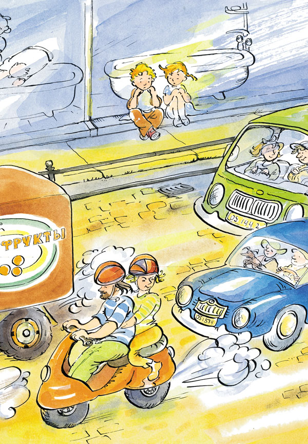 Грузовик подъехал и остановился прямо перед ними. Из него вышел мужчина. Некоторое время он с довольным видом разглядывал свой грузовик. Потом он вошёл в магазин, где продавались ванны.