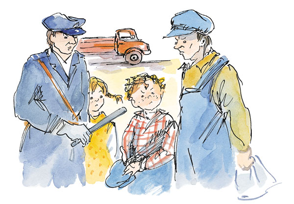 – Ладно, ладно, пойдёшь со мной в участок и там объяснишь, как всё случилось, – сказал полицейский. – До свиданья, ребята! Сейчас я пришлю к вам дежурного, он отвезёт вас домой на вашем грузовике. Ключ, я вижу, на месте.