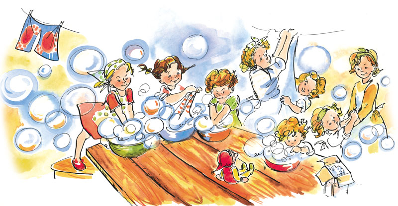 Первыми шли Малышка Мортен и Мина. Мама помогала им умываться, потом наливала в их тазики чистую воду, сыпала туда немного стирального порошка и спрашивала: