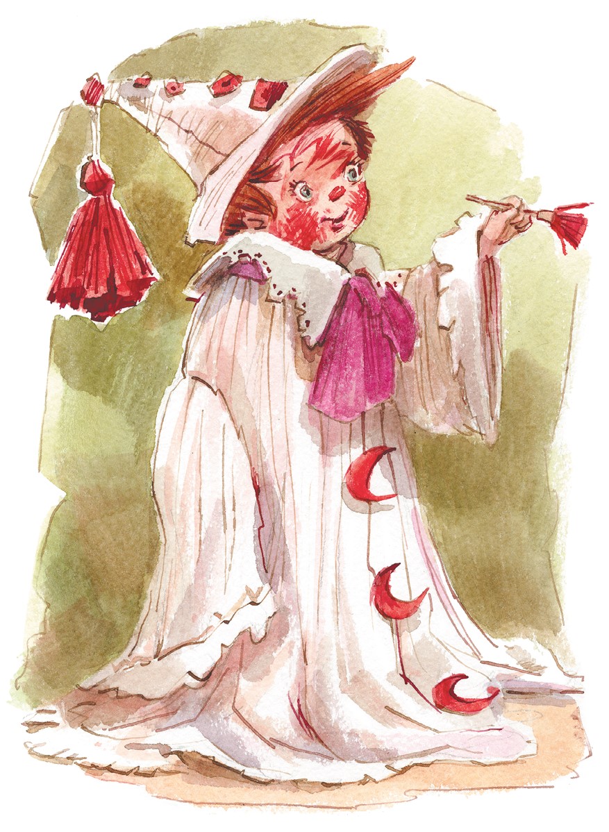 Рабочие принесли красный ковёр и стали разворачивать его. Пока они возились, на манеж пробрался клоун в белом балахоне с красными полумесяцами и в островерхом колпаке. Лицо у клоуна тоже было белое-белое, кроме щёк, они полыхали ярко-красным цветом. Он хотел помочь рабочим растянуть ковёр и приготовить манеж для следующего номера, но всё время спотыкался, за всё цеплялся и падал так неудачно, что и рабочие спотыкались об него. Вдруг он кувыркнулся через голову, залез под ковёр – и давай оттуда хихикать и всеми командовать! Это было очень смешно, Уле-Александр хохотал так, что уже сил не было смеяться. Но рабочие в красной форме рассердились на клоуна, они запихали его в большой мешок и унесли. Уле-Александр огорчился. Пусть бы лучше клоун дурачился весь вечер!